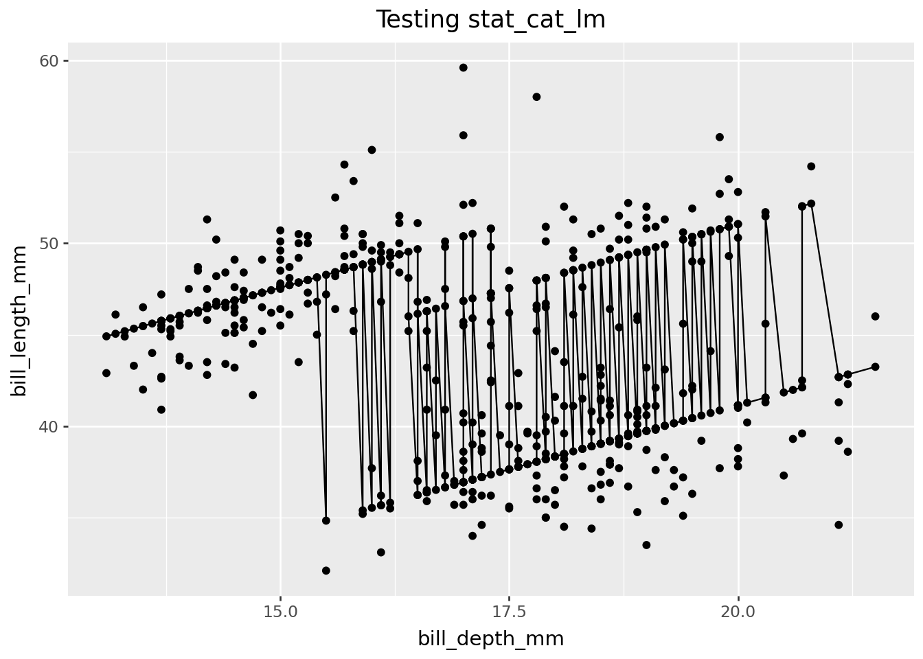 … that we prepare the data to have columns with names x, y, and cat before testing compute_panel_cat_lm. Computation will fail if these names are not present given our function definition. Internally in a plot, columns are named based on aesthetic mapping, e.g. aes(x="bill_depth_mm", y="bill_length_mm", cat="species").